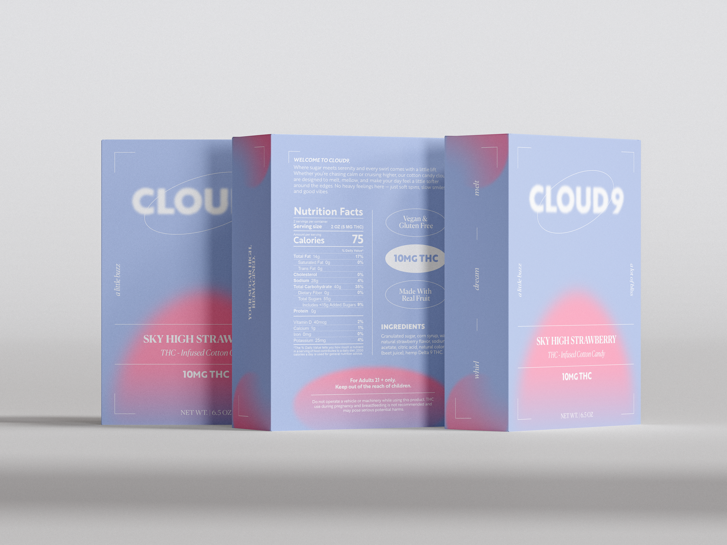 Cloud 9 is a shop serving THC-infused cotton candy and cloudy drinks. The name evokes whirling, airy, blissful feelings. Each flavor of cotton candy is also reminiscent of a dream-like, ethereal world. Branding includes blurred imagery, gradients, fuzzy textures, delicate lines, and soft, rounded shapes.