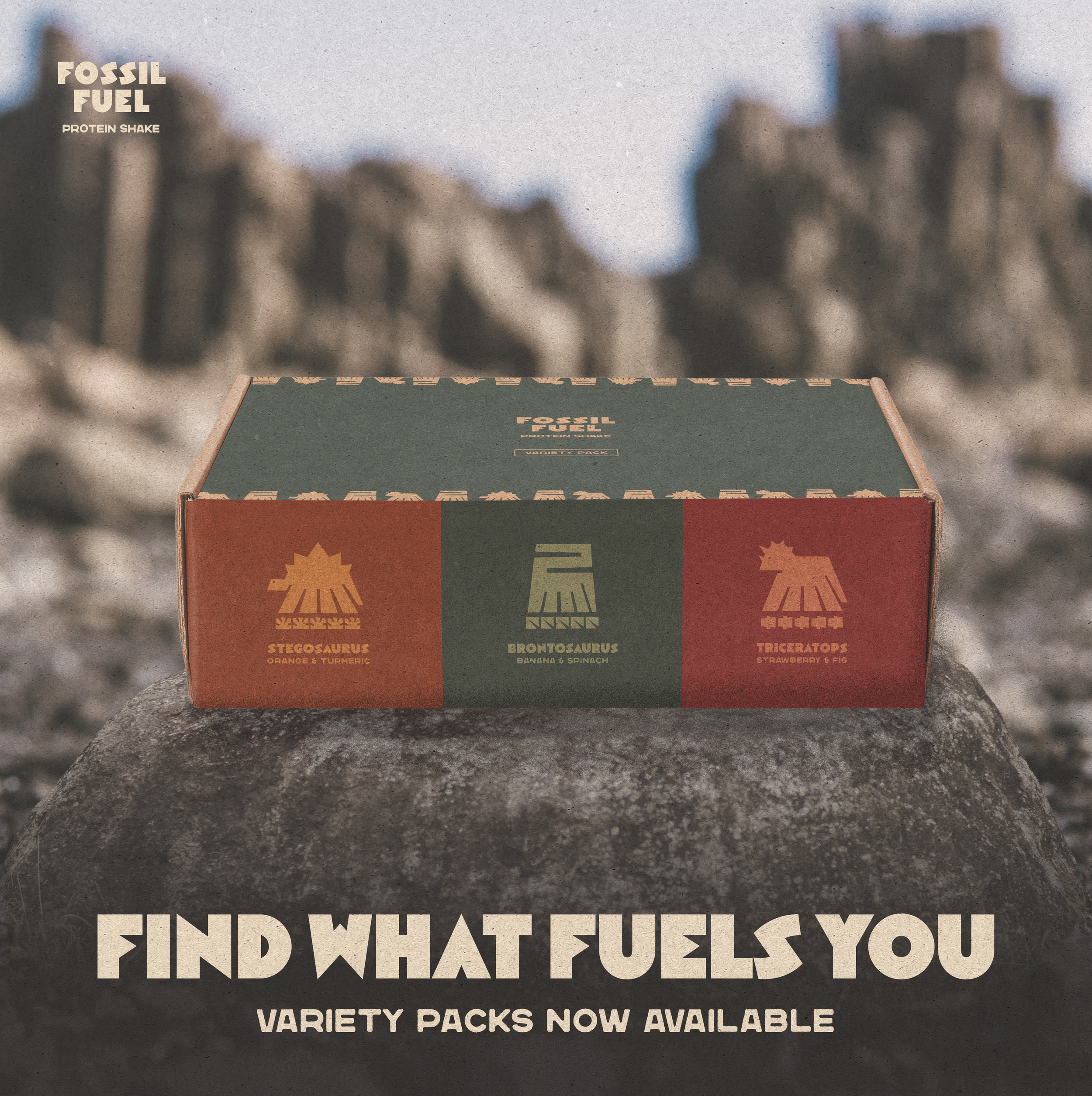 Fossil Fuel is inspired by the dinosaurs that once were the epitome of strength and resilience on this planet. These protein shakes are designed to provide essential nutrients, so the branding depicts imagery of dinosaurs that have been broken down into their simplest, building-block shapes. With rustic, earthy textures and colors, these shakes help remind us to stick to the basics of who we are.